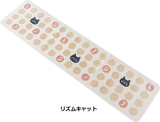 【リズムキャット】 ポップなどっと柄に、ところどころ音符がのっていて、楽しい気分にさせてくれます。 優しい色合いなのでネコがより際立ち、インテリアにもよく馴染みます。 マットは、シャツなどを製造するときに出るハギレを再利用し、糸にした再生糸でできた生地にプリントしました。 環境にもやさしく、ナチュラルな風合いが特徴的なマットです。 【クロネコ】 トラ柄の母猫と黒猫黒の新しいキッチンモチーフをちりばめました。 優れた耐久性と丸洗いできるお洗濯しやすい素材でいつでも清潔。 サイズ:約45cm×180cm マットの高さ 約5mm 素材:綿・ポリエステル・アクリル・レーヨン・その他 裏面すべり止め加工 日本製 当店でお買い物していただくと、主に北海道銘菓など北海道に関する物をオマケで付けていました。 クッション材の代わりに入れる事で少しでもゴミを減らす目的と、ご注文いただく事への感謝の気持ちです。気に入っていただけたら、幸いです。