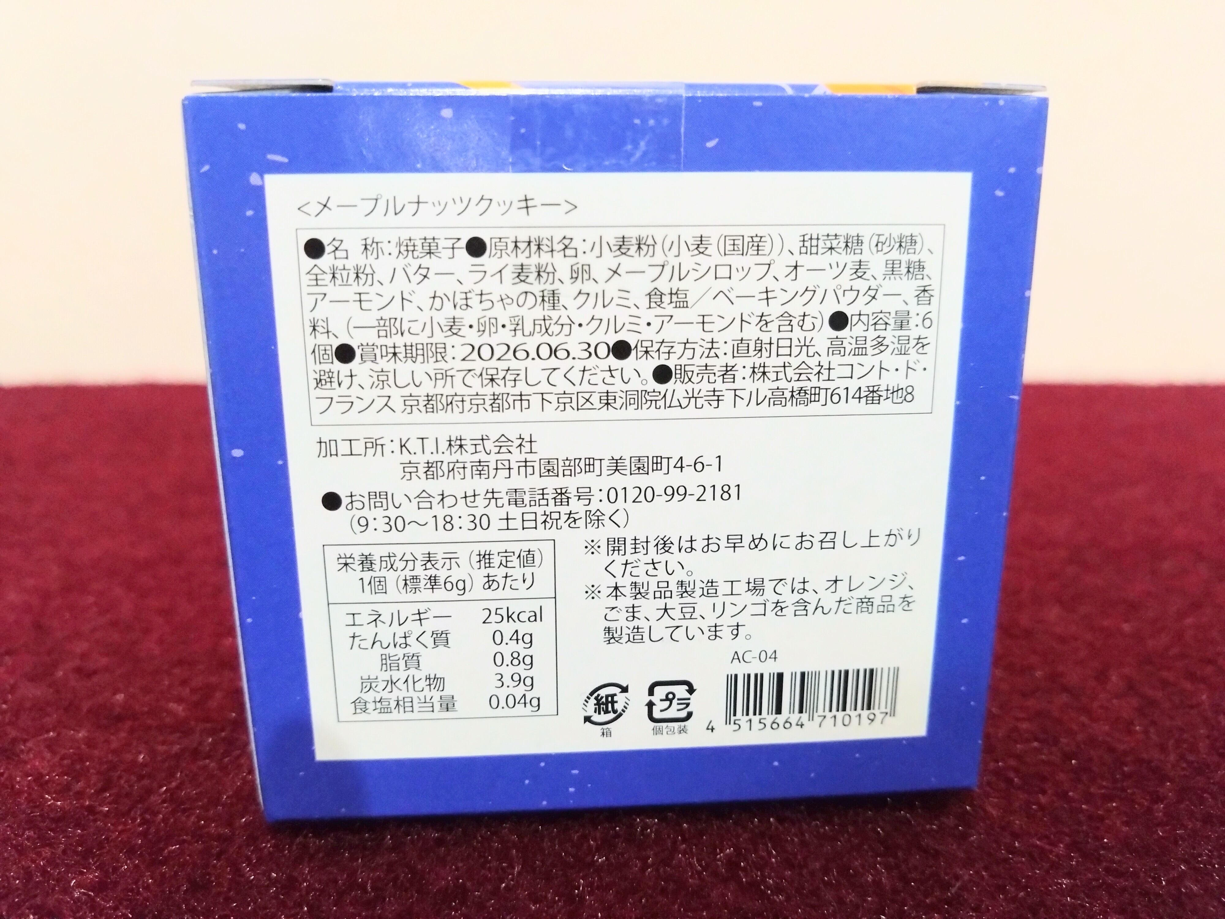 メープルナッツクッキー原材料:小麦粉(小麦(国産))、甜菜糖(砂糖)、全粒粉、バター、ライ麦粉、卵、メープルシロップ、オーツ麦、黒糖、アーモンド、かぼちゃの種、クルミ、食塩/ベーキングパウダー、香料、(一部に小麦・卵・乳成分・クルミ・アーモンドを含む)