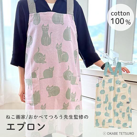 ねこ画家、おかべてつろう先生のねこのイラストがかわいいエプロンになりました。