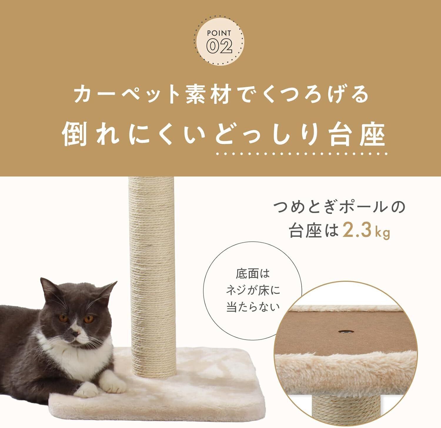 猫が体重を預けても倒れないよう、台座には十分な重量を持たせました。台座表面はカーペット素材になっており、くつろぎスペースとしても使えます。