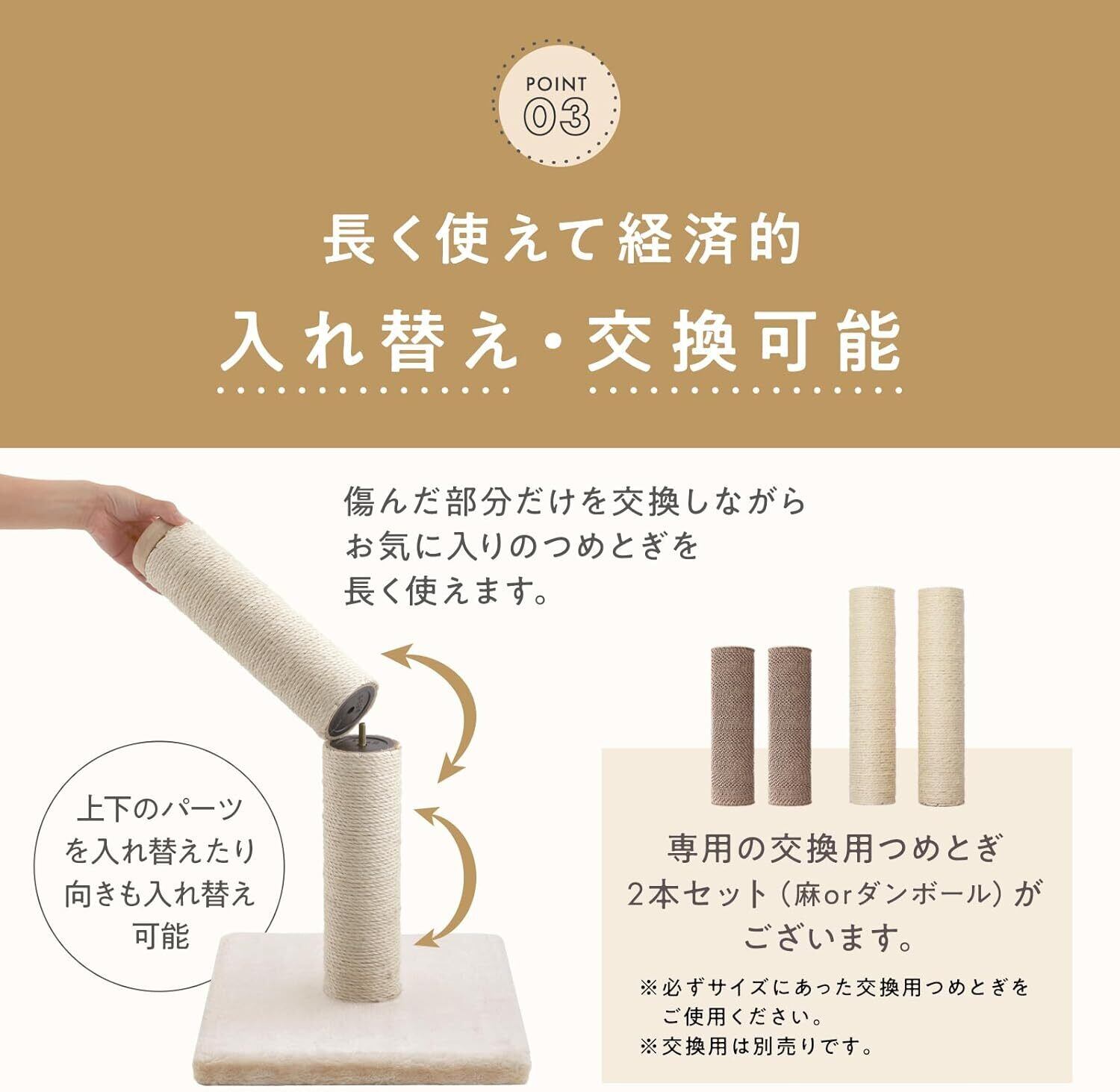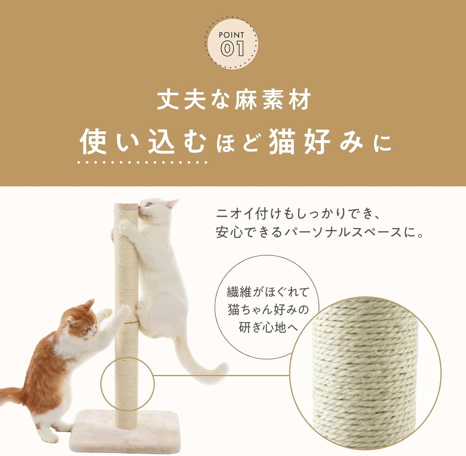 丈夫な麻素材は、使い込むほどに繊維がほぐれて柔らかくなり、猫好みの研ぎ心地へと変化します。ニオイ付けもしっかりでき、安心できるパーソナルスペースになります。