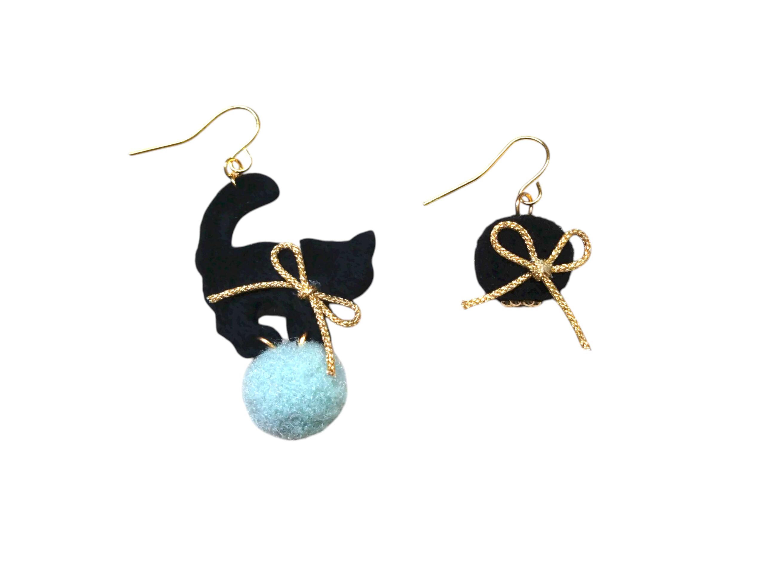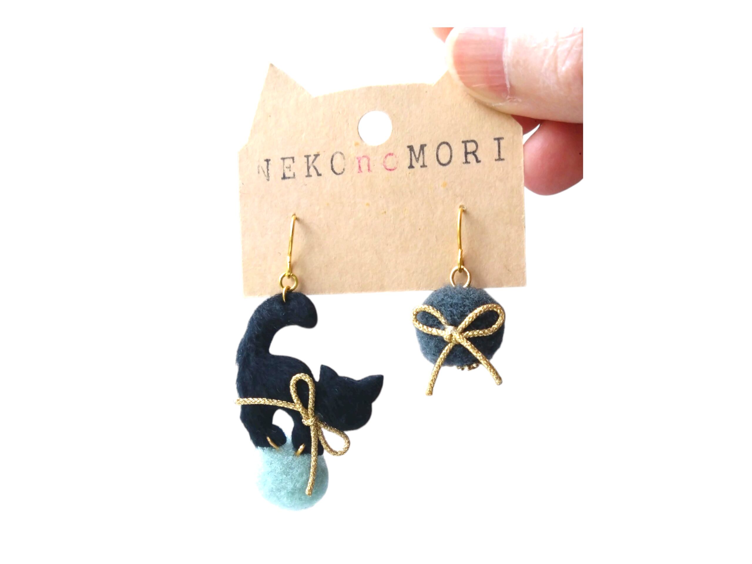 黒猫がポンポンの上に乗ったようなデザインのピアスです。
