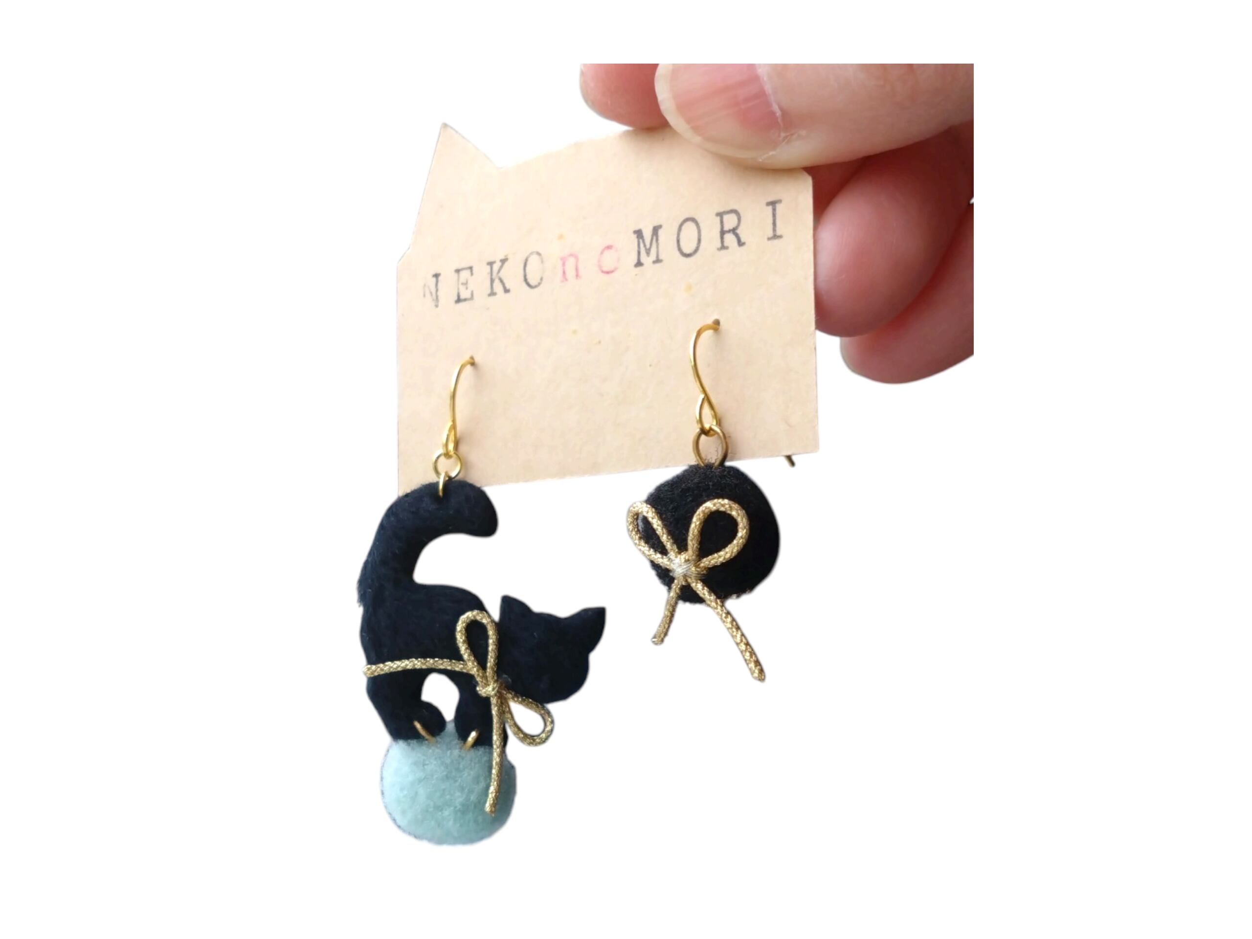 【クリックポスト対応】1200黒猫とポンポン リボン猫 ポンポン アシンメトリー ねこモチーフ ねこのもり