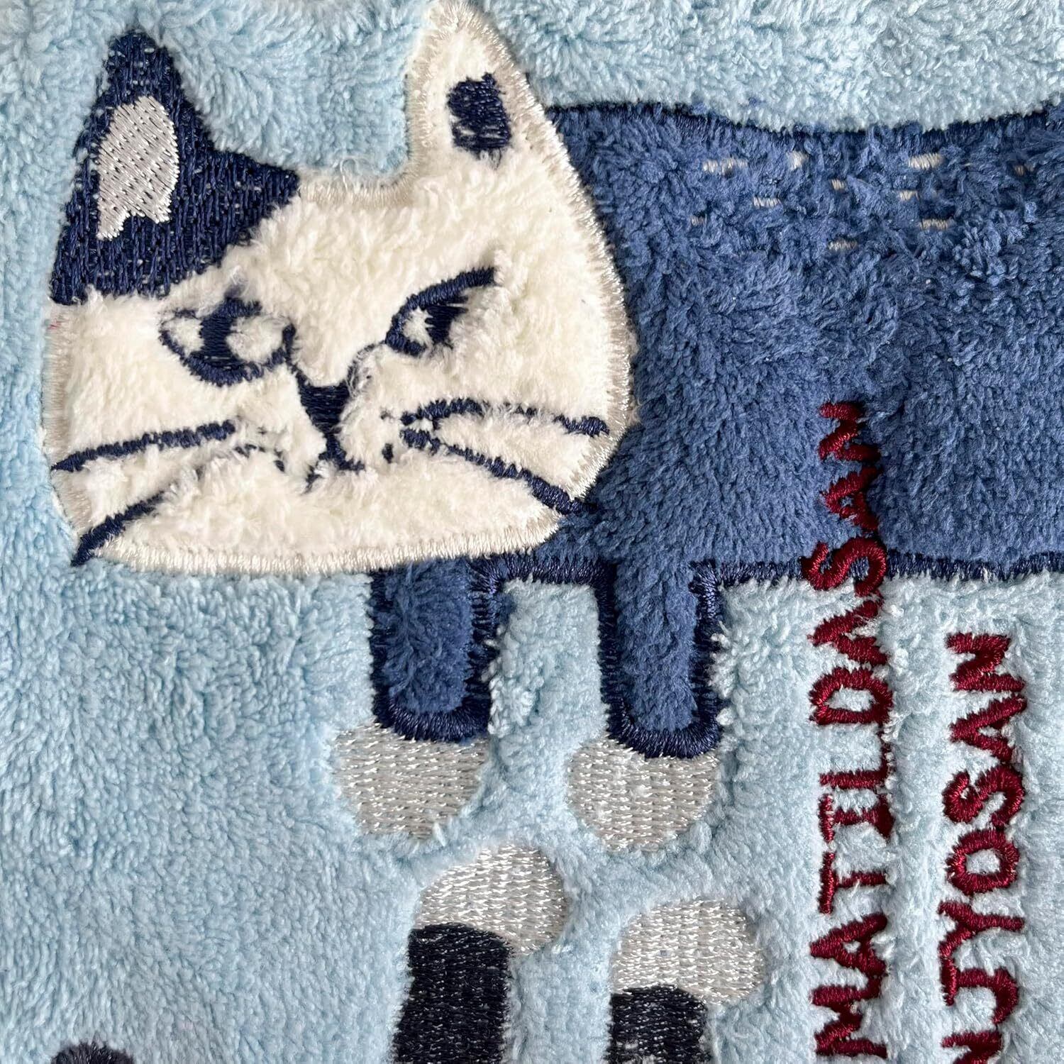 ネコキャラクターがアップリケされたマイクロファイバーのハンドタオル。