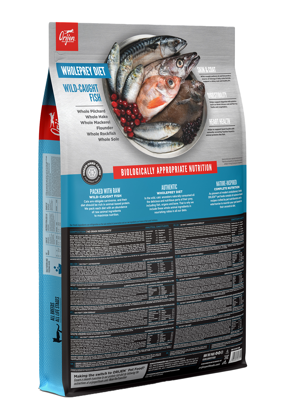生の丸ごとイワシ (28%), 生の丸ごとヘイク (7%), 生の丸ごとサバ (6%), 生カレイ(5%), 生の丸ごとメバル (5%), 生の丸ごとシタビラメ (5%), ディハイドレートサバ (5%), ディハイドレートニシン (5%), ディハイドレートアオギス (5%), ポロック油 (5%), ディハイドレート白身魚 (5%), ディハイドレートイワシ (4%), ヒマワリ油, 丸ごと赤レンズ豆, 丸ごと緑レンズ豆, 丸ごとエンドウ豆, レンズ豆繊維, 丸ごとヒヨコ豆, 丸ごとピント豆, エンドウ豆スターチ, 乾燥ケルプ, 新鮮丸ごとカボチャ, 新鮮丸ごとバターナッツスクワッシュ, 新鮮丸ごとズッキーニ, 新鮮丸ごとニンジン, 新鮮丸ごとリンゴ, 新鮮丸ごと洋梨, 乾燥チコリールート, 新鮮ケール, 新鮮ホウレン草, 新鮮ビートの葉, 新鮮カブラ菜, 丸ごとクランベリー, 丸ごとブルーベリー, 丸ごとサスカトゥーンベリー, ターメリック, オオアザミ, ゴボウ, ラベンダー, マシュマロルート, ローズヒップ 酸化防止剤: 植物油から抽出したトコフェロール: 121mg, クエン酸: 40mg, ローズマリーエキス: 80mg 添加栄養素(1kgあたり): 3a890 塩化コリン (コリン): 1190mg, 3b606 (亜鉛: 105mg), 3b406 (銅: 11mg), 3a821 ビタミンB1: 12.5mg, 3a825i ビタミンB2: 10mg, 3a314 ビタミンB3: 50mg, 3a841 ビタミンB5: 8mg, 3a831 ビタミンB6: 6.5mg, 3a316 ビタミンB9: 0.75mg, 3a880 ビタミンB7: 0.13mg, ビタミン B12: 0.1g, 3a710 ビタミンK3: 0.5mg, 3a672a ビタミンA: 3750 IU, 3a671 ビタミンD3: 500 IU, 3a700 ビタミンE: 410 IU, 3a300 ビタミンC: 12.5 IU 添加腸球菌: 4b1707 エンテロコッカスフェシウム菌NCIMB 10415 1x10^9 CFU